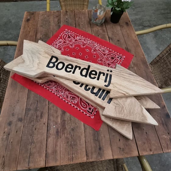 Deze stoere eiken houten wegwijzer gefreesd kan naar wens worden gepersonaliseerd. We frezen er iedere tekst in die je zou willen. Dat maakt deze pijl tot een uniek cadeau, zeer geschikt voor grote gelegenheden als bijvoorbeeld bruiloften of bijzondere verjaardagen. En wat te denken van een pijl met gevatte quote onder je afdak in de tuin of als naambord aan de deur? Deze pijl kan op vele manieren gebruikt worden.
