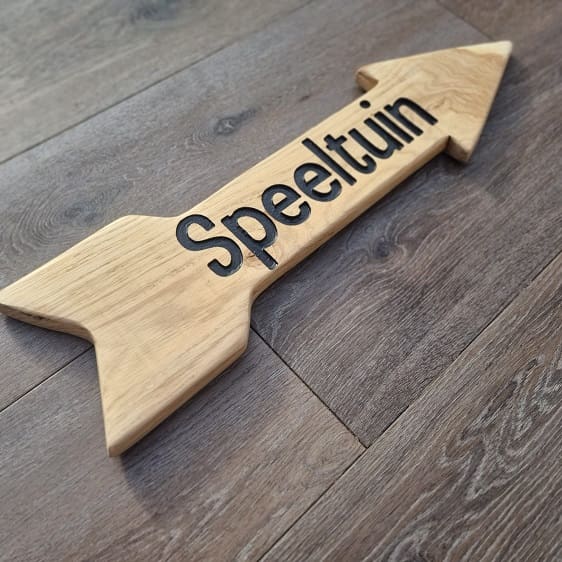 De Eiken houten wegwijzer gefreesd is volledig in eigen beheer gemaakt en heeft een lengte van ongeveer 95 cm. De pijl kan gebruikt worden als bewegwijzering, maar ook als decoratie artikel. Je kunt hem ophangen, maar ook neerzetten en hebt daarmee een echte eyecatcher voor op je veranda, in je tuin of gewoon in huis.. Een hippe woonaccessoire, die ook nog eens volledig naar jouw smaak aan te passen is met een persoonlijke quote. Bij de bestelnotitie kun je alles doorgeven wat we nodig hebben om een passend ontwerp te maken. Dat zit bij een gefreesd bord namelijk inbegrepen.
