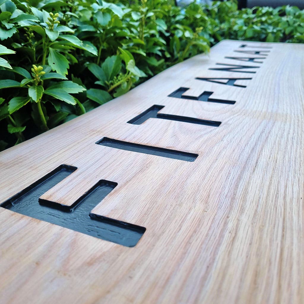 Ben je op zoek naar een robuust houten bord met diep gefreesde letters? Ons eiken schaaldeel gefreesd in kleur is precies wat je zoekt! Met een freesmachine worden de letters zorgvuldig diep in het hout uitgesneden, met een minimale diepte van 5 mm. Zo ontstaat een 3D-effect dat lang leesbaar blijft, zelfs langer dan bij een gebrand bord. Hout blijft natuurlijk reageren op weersinvloeden, waardoor de levensduur altijd enigszins kan variëren.