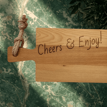 Hapjesplank van gestoomd Europees beukenhout. Afmeting 59x20x2 cm. Helemaal te personaliseren met tekst en/afbeeldingen.